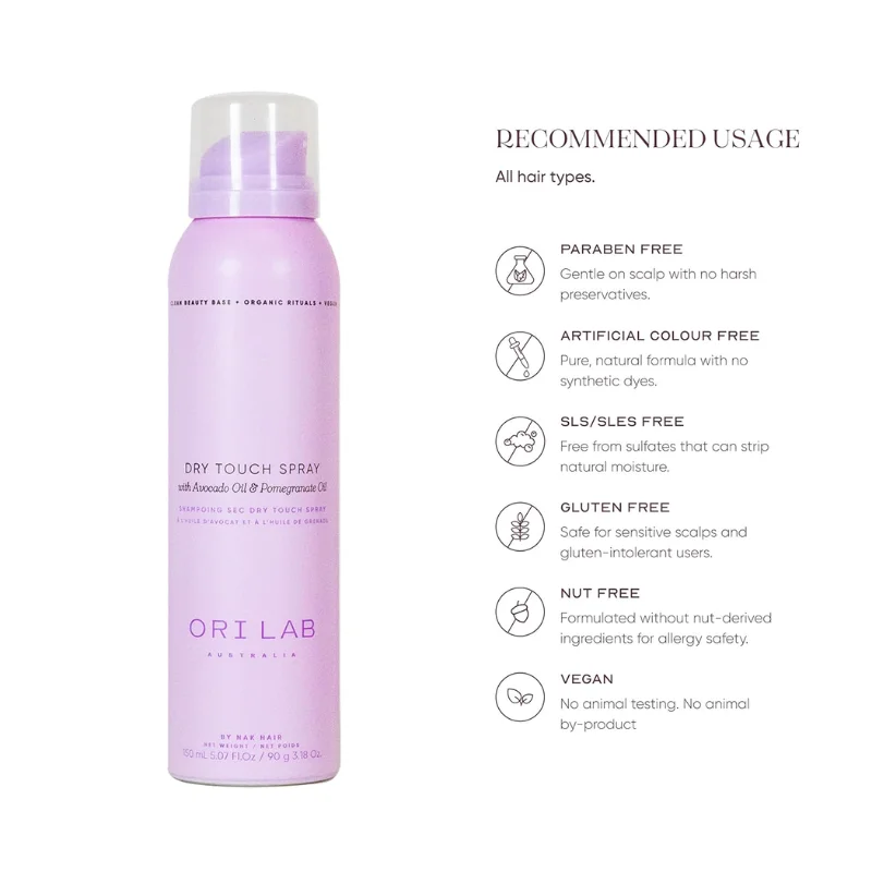 Refresh your hair in seconds with ORI Lab Dry Touch Spray 150ml, a lightweight dry shampoo designed to absorb excess oil and add soft texture without leaving residue. Perfect for busy mornings or extending the life of your blow-dry, this “barely there” formula keeps hair feeling clean, fresh and lifted.