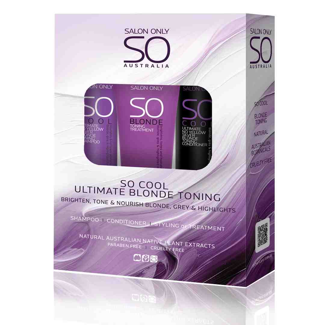 The Salon Only Cool Quad Pack: the ultimate silver blonde toning range to remove yellow for brighter blonde, grey and highlighted hair. Includes: SO COOL Shampoo, SO COOL Conditioner, SO Hot, SO Blonde Toning Treatment.